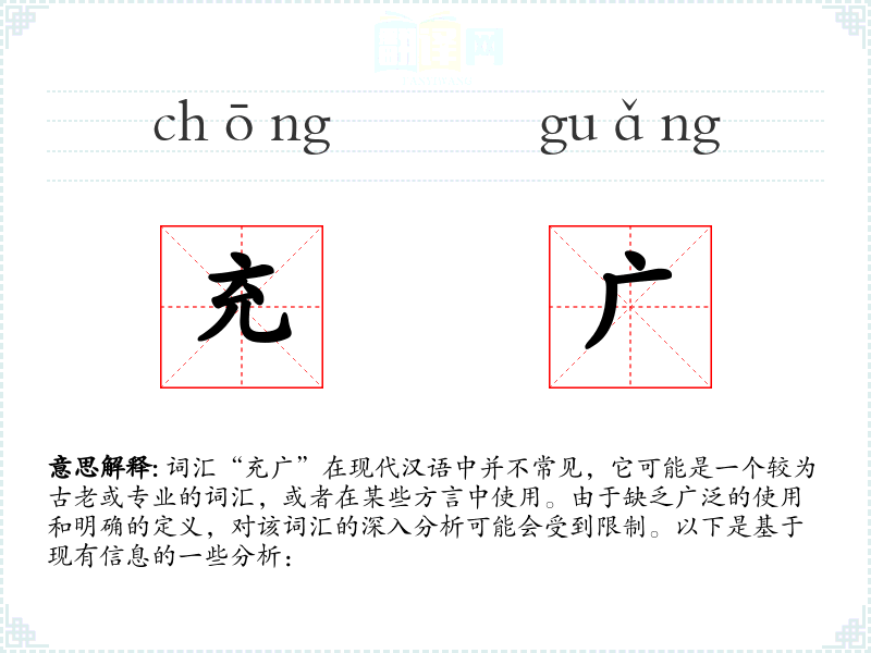 词汇“充广”在现代汉语中并不常见,它可能是一个较为古老或专业的词汇,或者在某些方言中使用。由于缺乏广泛的使用和明确的定义,对该词汇的深入分析可能会受到限制。以下是基于现有信息的一些分析: