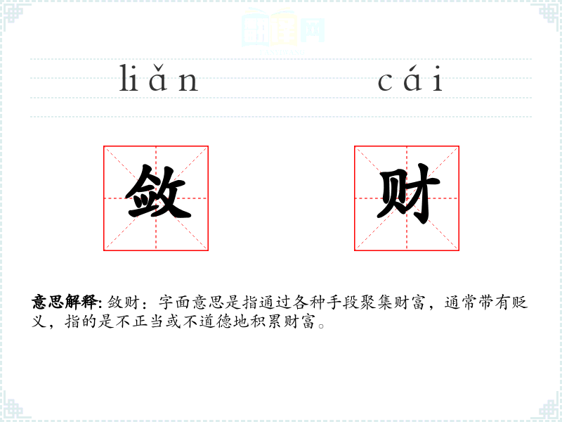 敛财:字面意思是指通过各种手段聚集财富,通常带有贬义,指的是不正当或不道德地积累财富。