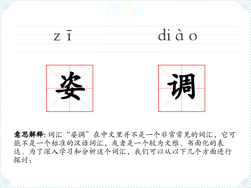 词汇“姿调”在中文里并不是一个非常常见的词汇,它可能不是一个标准的汉语词汇,或者是一个较为文雅、书面化的表达。为了深入学习和分析这个词汇,我们可以从以下几个方面进行探讨: