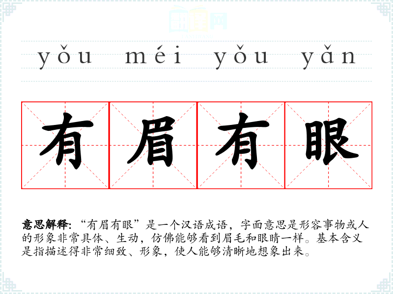“有眉有眼”是一个汉语成语,字面意思是形容事物或人的形象非常具体、生动,仿佛能够看到眉毛和眼睛一样。基本含义是指描述得非常细致、形象,使人能够清晰地想象出来。