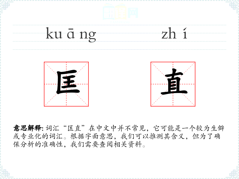 词汇“匡直”在中文中并不常见,它可能是一个较为生僻或专业化的词汇。根据字面意思,我们可以推测其含义,但为了确保分析的准确性,我们需要查阅相关资料。