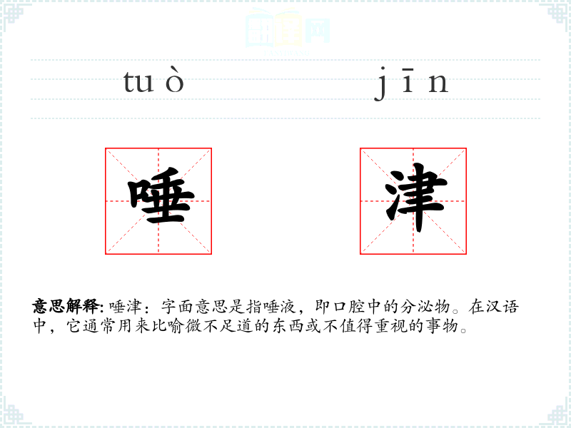 唾津:字面意思是指唾液,即口腔中的分泌物。在汉语中,它通常用来比喻微不足道的东西或不值得重视的事物。