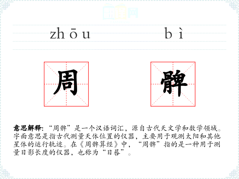 “周髀”是一个汉语词汇,源自古代天文学和数学领域。字面意思是指古代测量天体位置的仪器,主要用于观测太阳和其他星体的运行轨迹。在《周髀算经》中,“周髀”指的是一种用于测量日影长度的仪器,也称为“日晷”。