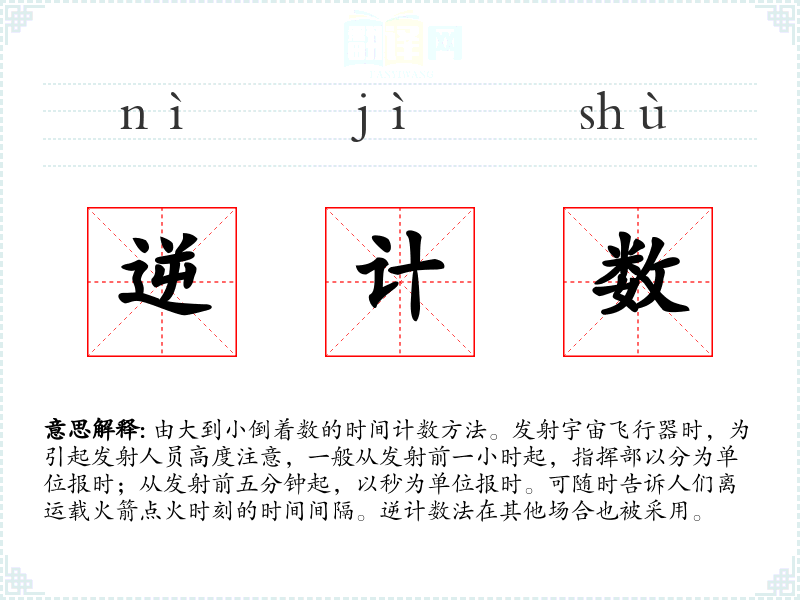 1.由大到小倒着数的时间计数方法。发射宇宙飞行器时,为引起发射人员高度注意,一般从发射前一小时起,指挥部以分为单位报时;从发射前五分钟起,以秒为单位报时。可随时告诉人们离运载火箭点火时刻的时间间隔。逆计数法在其他场合也被采用。