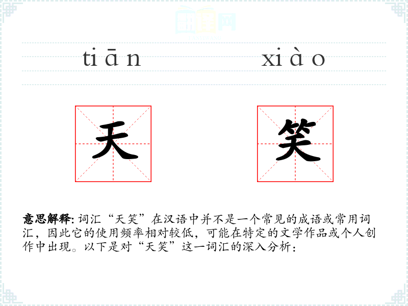 词汇“天笑”在汉语中并不是一个常见的成语或常用词汇,因此它的使用频率相对较低,可能在特定的文学作品或个人创作中出现。以下是对“天笑”这一词汇的深入分析: