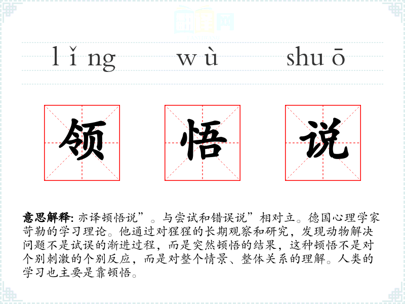 亦译顿悟说”。与尝试和错误说”相对立。德国心理学家苛勒的学习理论。他通过对猩猩的长期观察和研究,发现动物解决问题不是试误的渐进过程,而是突然顿悟的结果,这种顿悟不是对个别刺激的个别反应,而是对整个情景、整体关系的理解。人类的学习也主要是靠顿悟。