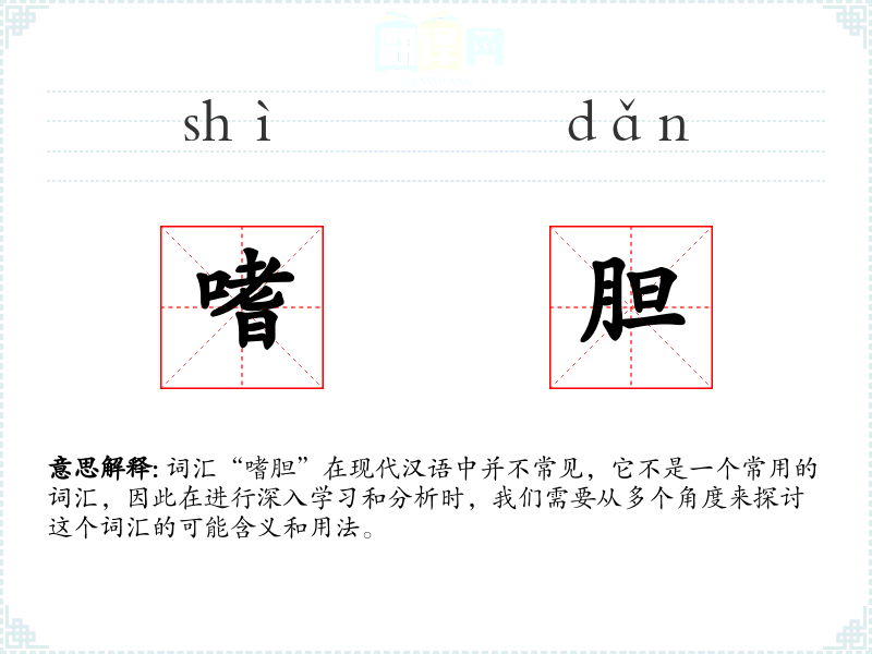 “嗜”字在古代汉语中意为喜好或爱好,“胆”则指胆囊或胆汁。在古代医学文献中,胆汁被认为与人的决断力和勇气有关,因此“嗜胆”可能被引申为对勇气和决断的追求。