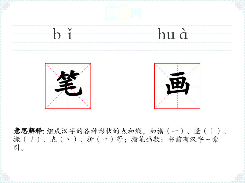 组成汉字的各种形状的点和线,如横(一)、竖(丨)、撇(丿)、点(丶)、折(乛)等;指笔画数:书前有汉字~索引。