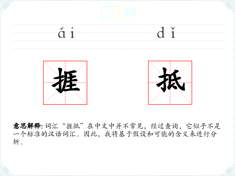 假设“捱抵”是一个由“捱”和“抵”组成的复合词,我们可以推测其字面意思为“忍受并抵抗”。其中,“捱”意味着忍受或坚持,而“抵”则意味着抵抗或对抗。