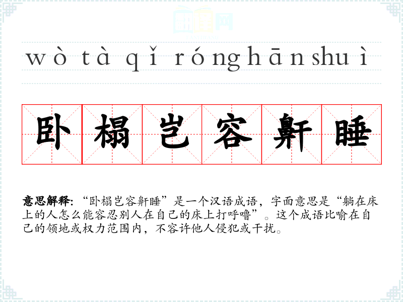 “卧榻岂容鼾睡”是一个汉语成语,字面意思是“躺在床上的人怎么能容忍别人在自己的床上打呼噜”。这个成语比喻在自己的领地或权力范围内,不容许他人侵犯或干扰。