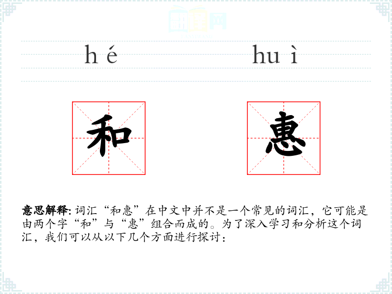 词汇“和惠”在中文中并不是一个常见的词汇,它可能是由两个字“和”与“惠”组合而成的。为了深入学*和分析这个词汇,我们可以从以下几个方面进行探讨: