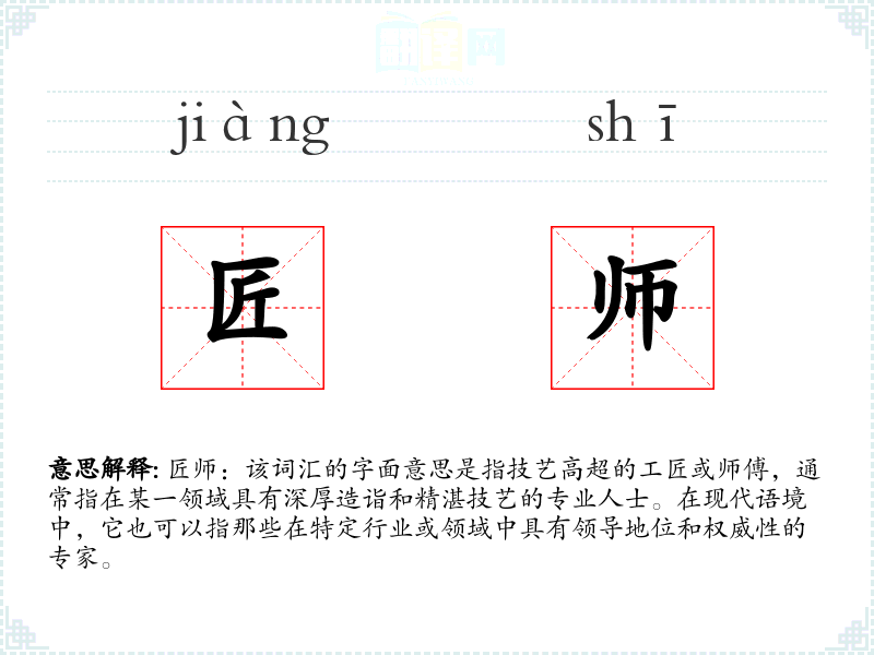 - 专业领域:在专业领域中,如建筑、工艺、艺术等,“匠师”指的是那些具有高级技能和丰富经验的专家。