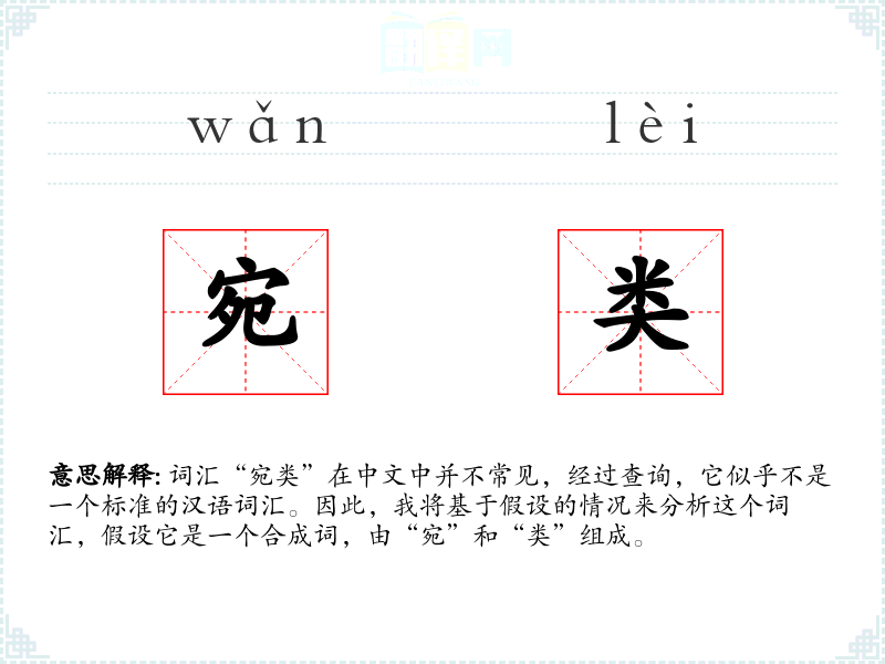 词汇“宛类”在中文中并不常见,经过查询,它似乎不是一个标准的汉语词汇。因此,我将基于假设的情况来分析这个词汇,假设它是一个合成词,由“宛”和“类”组成。
