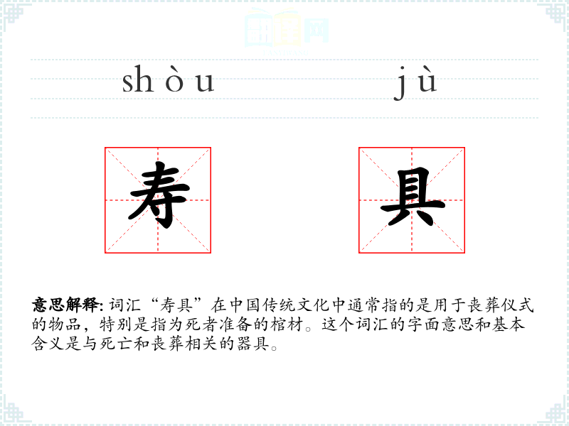 词汇“寿具”在**传统文化中通常指的是用于丧葬仪式的物品,特别是指为死者准备的棺材。这个词汇的字面意思和基本含义是与死亡和丧葬相关的器具。