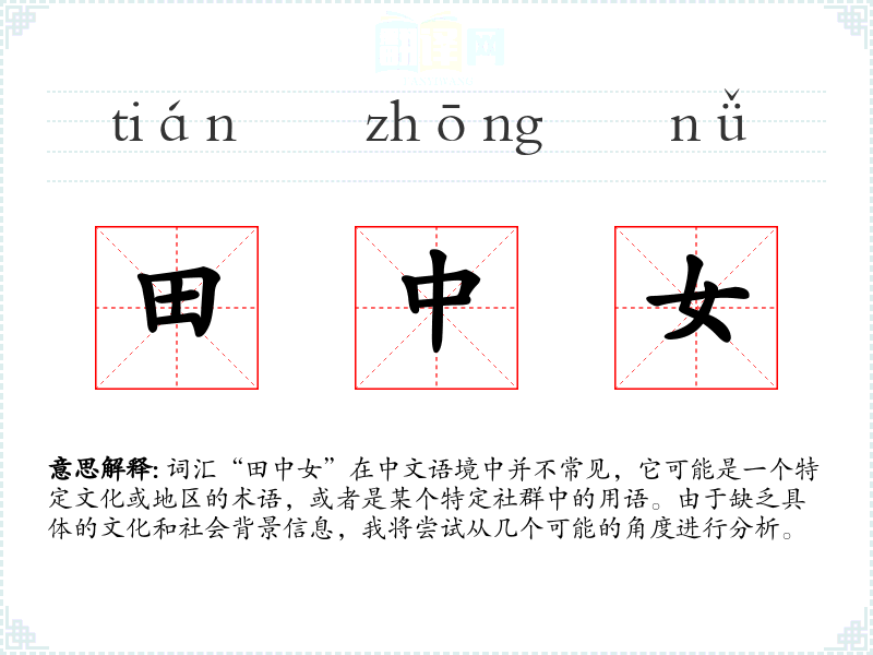 “田中女”字面意思可能是指“田地中的女性”或“田野中的女子”。这个词汇可能指的是在田间劳作的女性,或者是与田地有特定关联的女性。