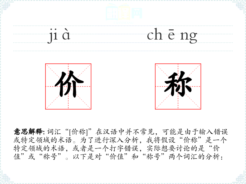 词汇“[价称]”在汉语中并不常见,可能是由于输入错误或特定领域的术语。为了进行深入分析,我将假设“价称”是一个特定领域的术语,或者是一个打字错误,实际想要讨论的是“价值”或“称号”。以下是对“价值”和“称号”两个词汇的分析: