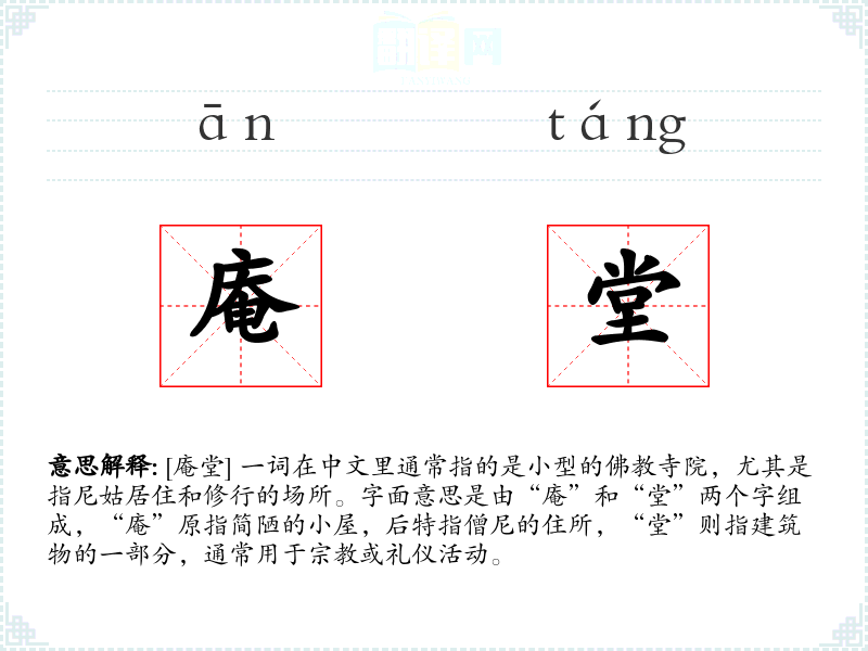 同义词中,“寺院”和“庙宇”更为通用,指各种**场所,而“精舍”则特指僧侣的住所,与“庵堂”在含义上较为接近。反义词则体现了“庵堂”所代表的宁静与超脱与世俗生活的对比。