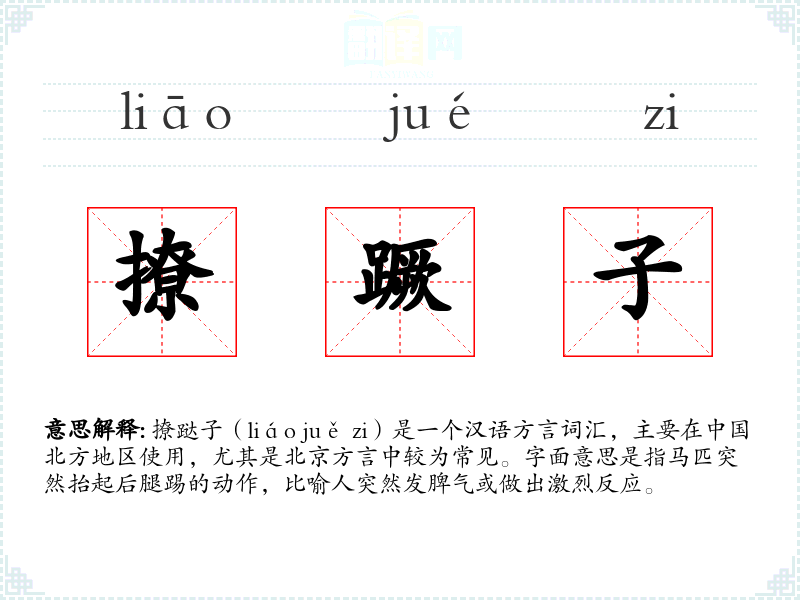 撩跶子(liáo juě zi)是一个汉语方言词汇,主要在**北方地区使用,尤其是北京方言中较为常见。字面意思是指马匹突然抬起后腿踢的动作,比喻人突然发脾气或做出激烈反应。