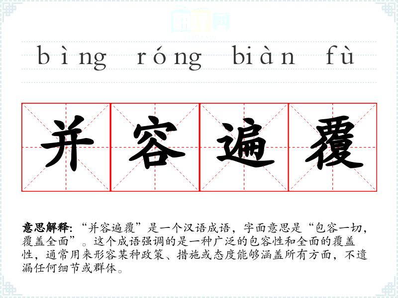 在文学作品中,“并容遍覆”可以用来形容一个宽广的胸怀或深远的视野,如“他的思想并容遍覆,能够包容各种不同的观点”。在口语中,这个成语可能不太常用,但在专业领域,如政治、管理或教育中,它可以用来描述一种全面的政策或管理方法。