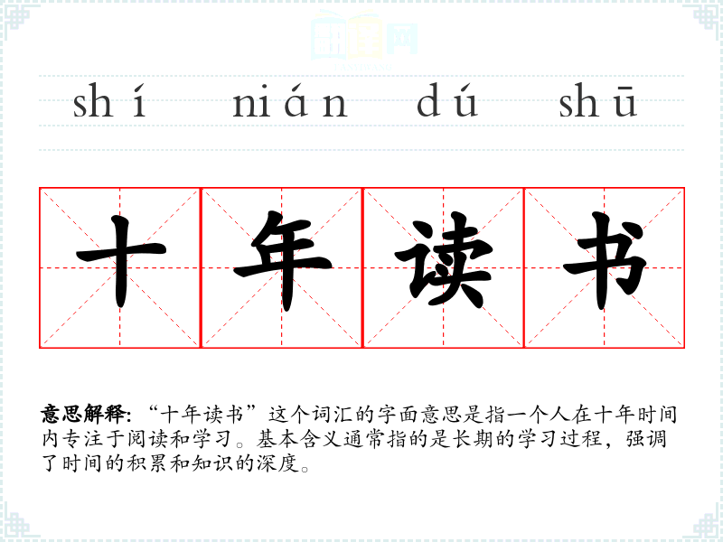 “十年读书”这个词汇的字面意思是指一个人在十年时间内专注于阅读和学。基本含义通常指的是长期的学过程,强调了时间的积累和知识的深度。
