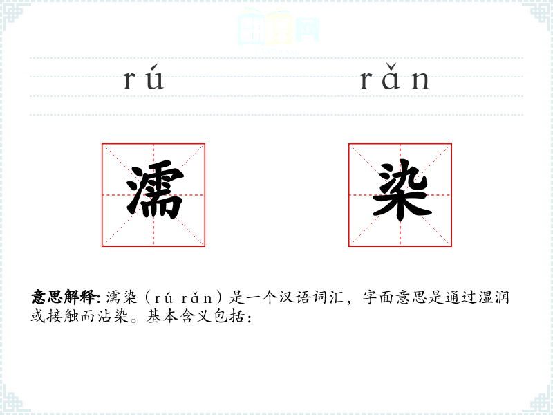 濡染(rú rǎn)是一个汉语词汇,字面意思是通过湿润或接触而沾染。基本含义包括: