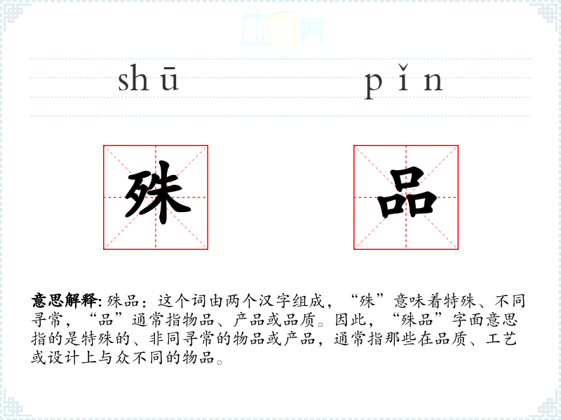 殊品:这个词由两个汉字组成,“殊”意味着特殊、不同寻常,“品”通常指物品、产品或品质。因此,“殊品”字面意思指的是特殊的、非同寻常的物品或产品,通常指那些在品质、工艺或设计上与众不同的物品。