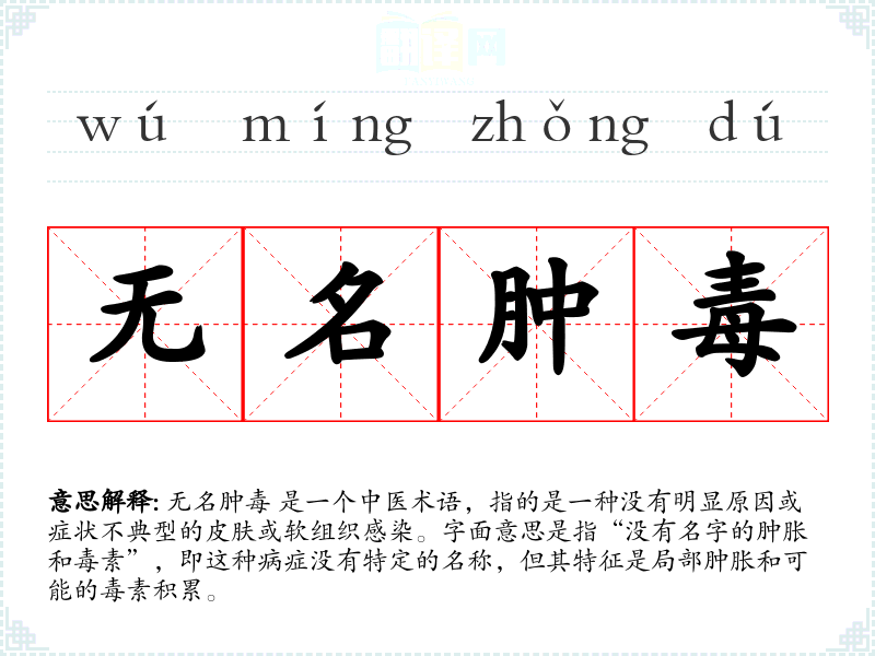 无名肿毒 是一个中医术语,指的是一种没有明显原因或症状不典型的皮肤或软组织感染。字面意思是指“没有名字的肿胀和毒素”,即这种病症没有特定的名称,但其特征是局部肿胀和可能的毒素积累。