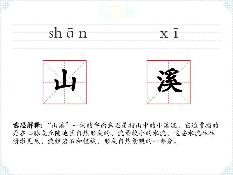 “山溪”一词的字面意思是指山中的小溪流。它通常指的是在山脉或丘陵地区自然形成的、流量较小的水流,这些水流往往清澈见底,流经岩石和植被,形成自然景观的一部分。