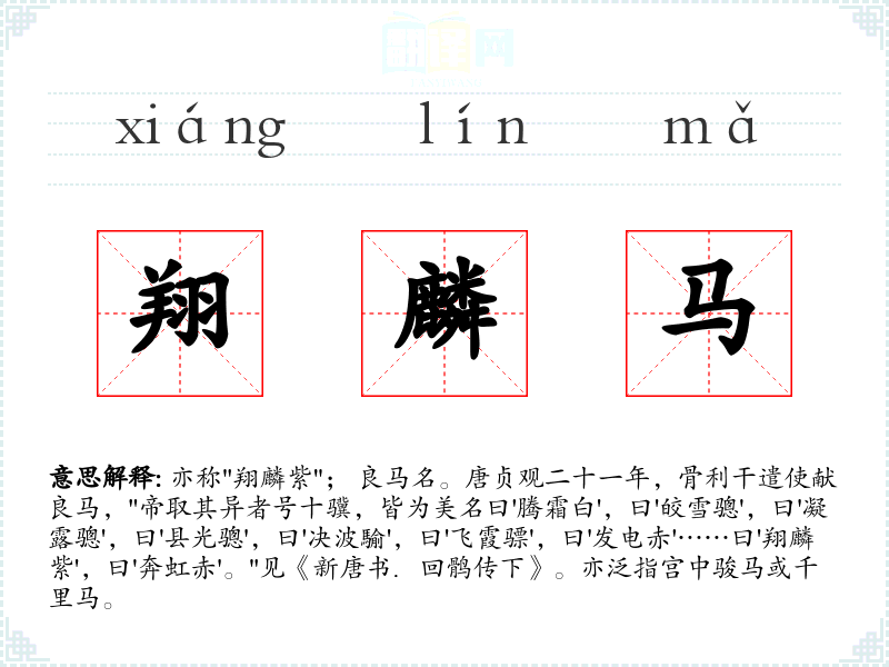 1.亦称"翔麟紫"; 良马名。唐贞观二十一年,骨利干遣使献良马,"帝取其异者号十骥,皆为美名曰'腾霜白',曰'皎雪骢',曰'凝露骢',曰'县光骢',曰'决波騟',曰'飞霞骠',曰'发电赤'……曰'翔麟紫',曰'奔虹赤'。"见《新唐书.回鹘传下》。亦泛指宫中骏马或千里马。