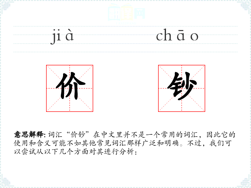 词汇“价钞”在中文里并不是一个常用的词汇,因此它的使用和含义可能不如其他常见词汇那样广泛和明确。不过,我们可以尝试从以下几个方面对其进行分析: