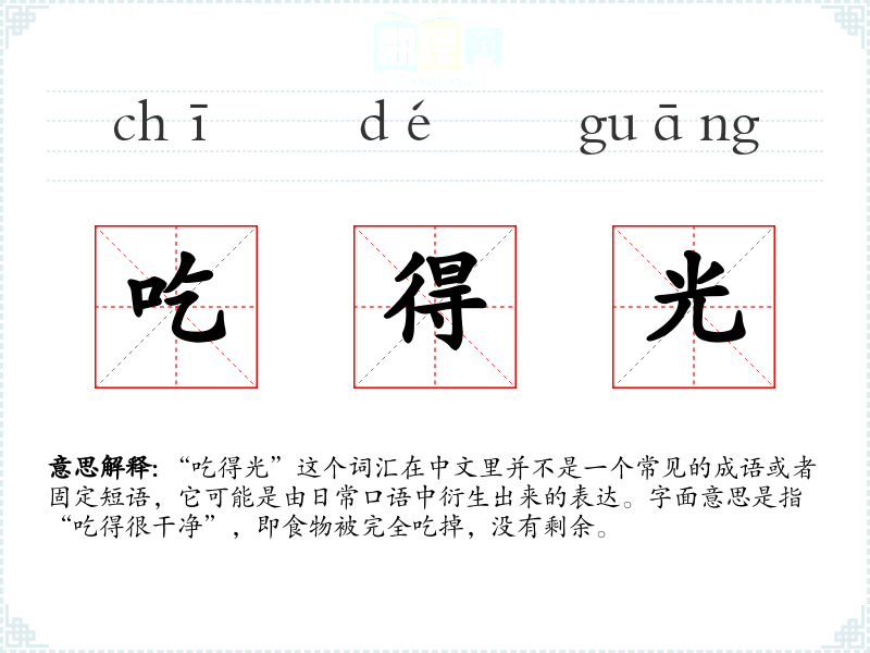 “吃得光”这个词汇在中文里并不是一个常见的成语或者固定短语,它可能是由日常口语中衍生出来的表达。字面意思是指“吃得很干净”,即食物被完全吃掉,没有剩余。