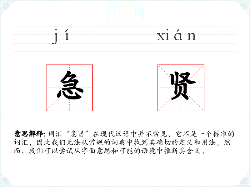 词汇“急贤”在现代汉语中并不常见,它不是一个标准的词汇,因此我们无法从常规的词典中找到其确切的定义和用法。然而,我们可以尝试从字面意思和可能的语境中推断其含义。