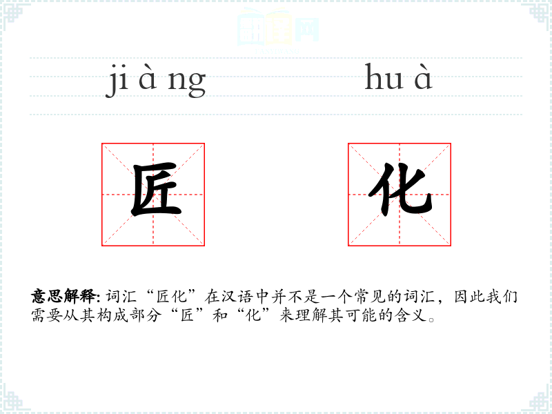 - 词源:“匠”字古已有之,指工匠、手艺人;“化”字则有变化、转化的意思。