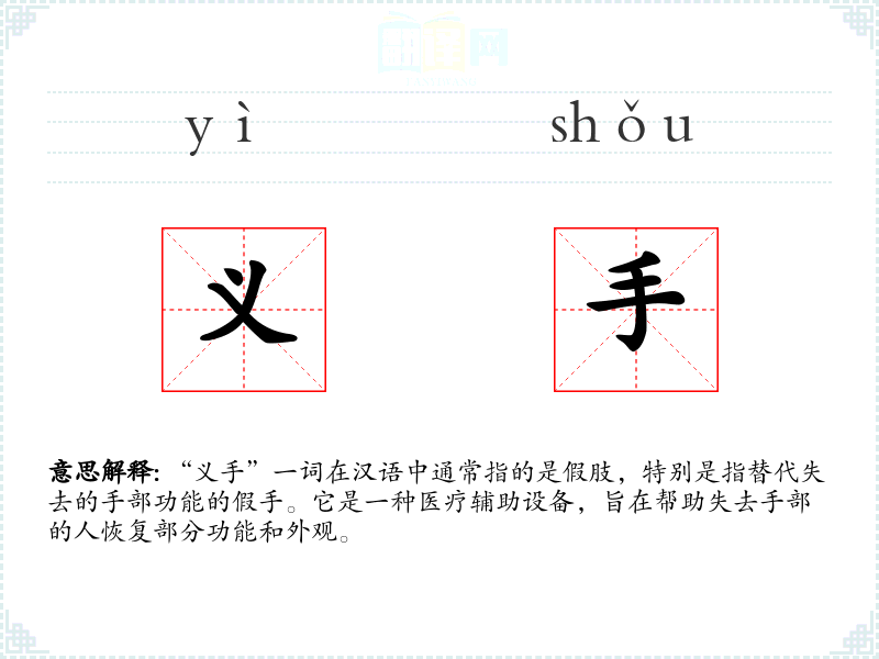 在医学和康复领域,“义手”是一个专业术语,用于描述各种类型的假肢,包括机械式、电动式和肌电式等。在日常生活中,人们可能会用这个词来指代任何类型的假手,无论是用于医疗目的还是装饰目的。在文学作品中,这个词可能会被用来象征性地表达失去和重获的主题。