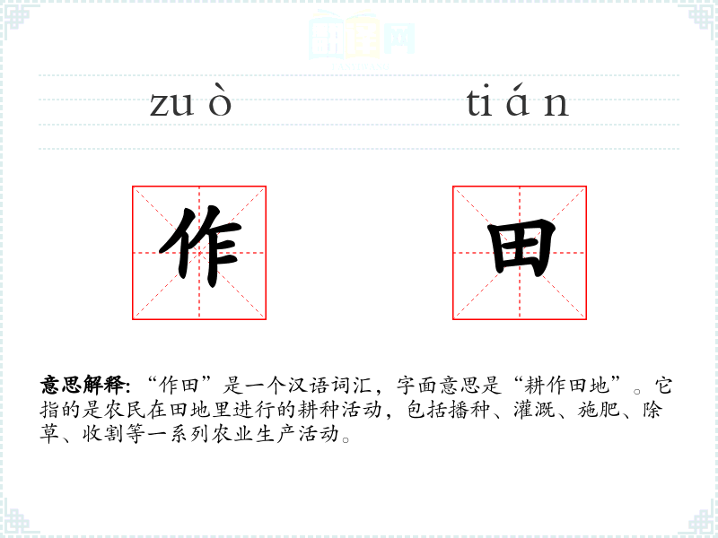 “作田”是一个汉语词汇,字面意思是“耕作田地”。它指的是农民在田地里进行的耕种活动,包括播种、灌溉、施肥、除草、收割等一系列农业生产活动。