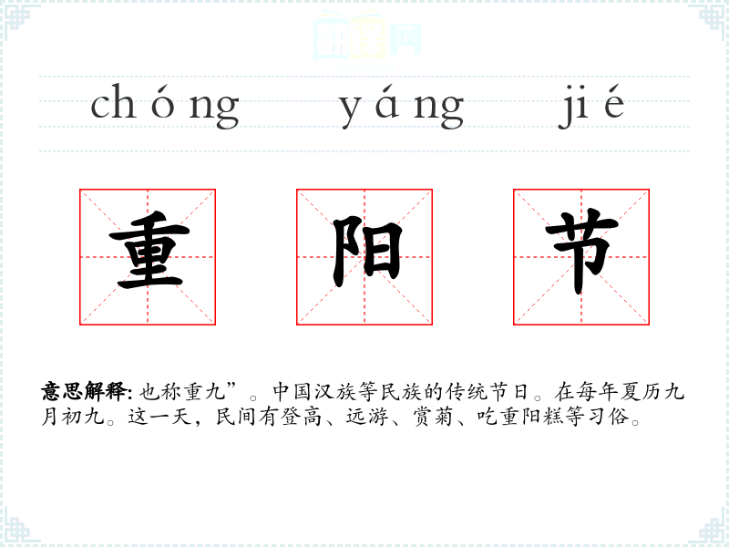 也称重九”。中国汉族等民族的传统节日。在每年夏历九月初九。这一天,民间有登高、远游、赏菊、吃重阳糕等习俗。