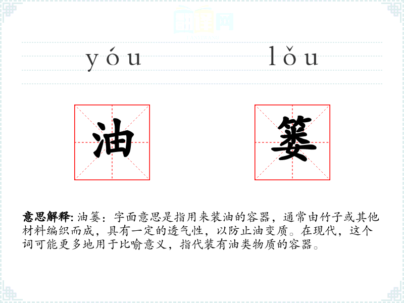 油篓:字面意思是指用来装油的容器,通常由竹子或其他材料编织而成,具有一定的透气性,以防止油变质。在现代,这个词可能更多地用于比喻意义,指代装有油类物质的容器。