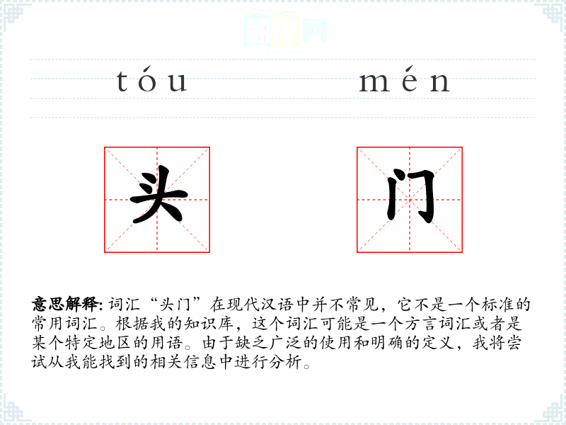 词汇“头门”在现代汉语中并不常见,它不是一个标准的常用词汇。根据我的知识库,这个词汇可能是一个方言词汇或者是某个特定地区的用语。由于缺乏广泛的使用和明确的定义,我将尝试从我能找到的相关信息中进行分析。