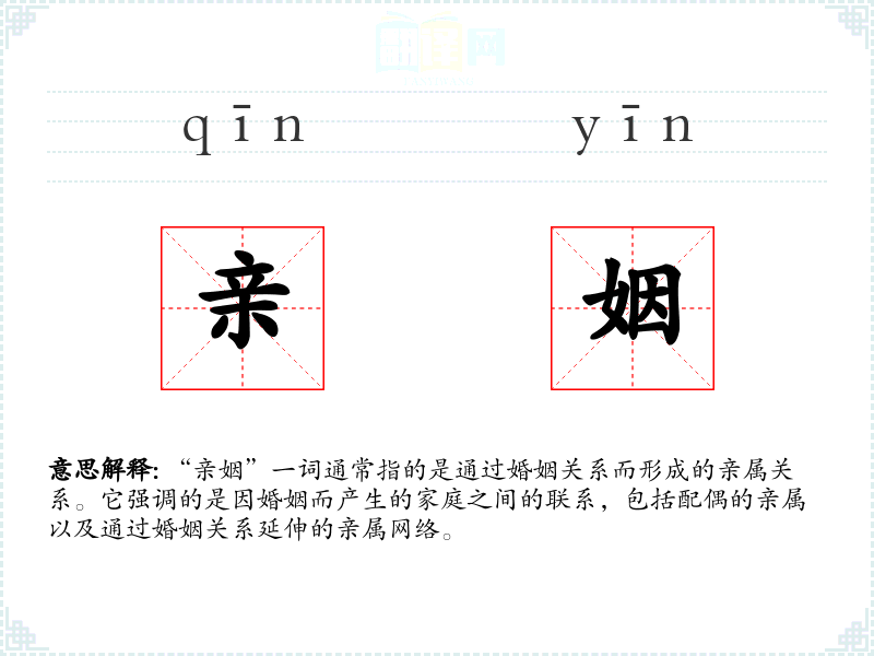 视觉上,“亲姻”可能让人联想到家族树或家庭聚会的照片。听觉上,它可能与家庭成员的笑声和对话声联系在一起。
