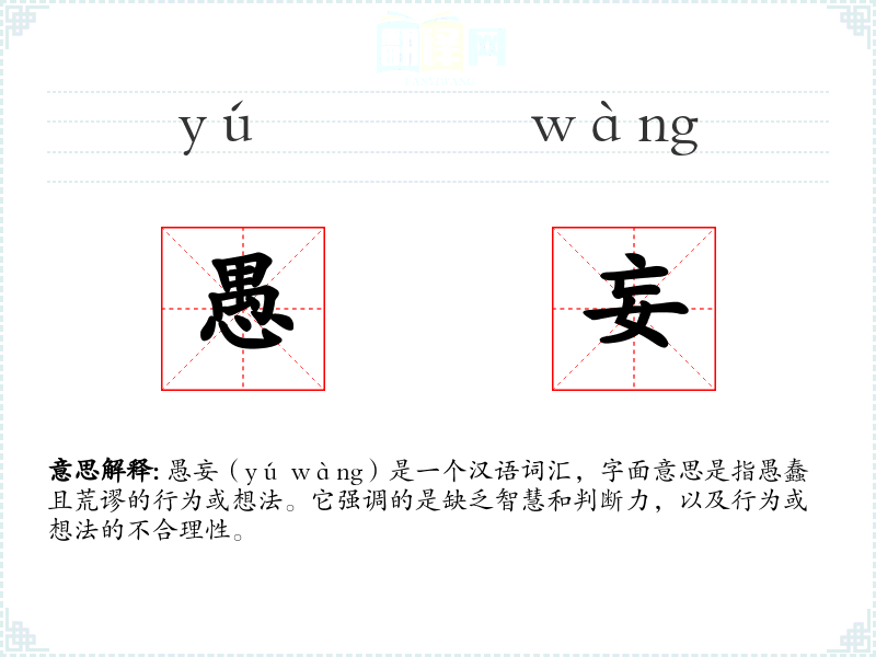 愚妄(yú wàng)是一个汉语词汇,字面意思是指愚蠢且荒谬的行为或想法。它强调的是缺乏智慧和判断力,以及行为或想法的不合理性。