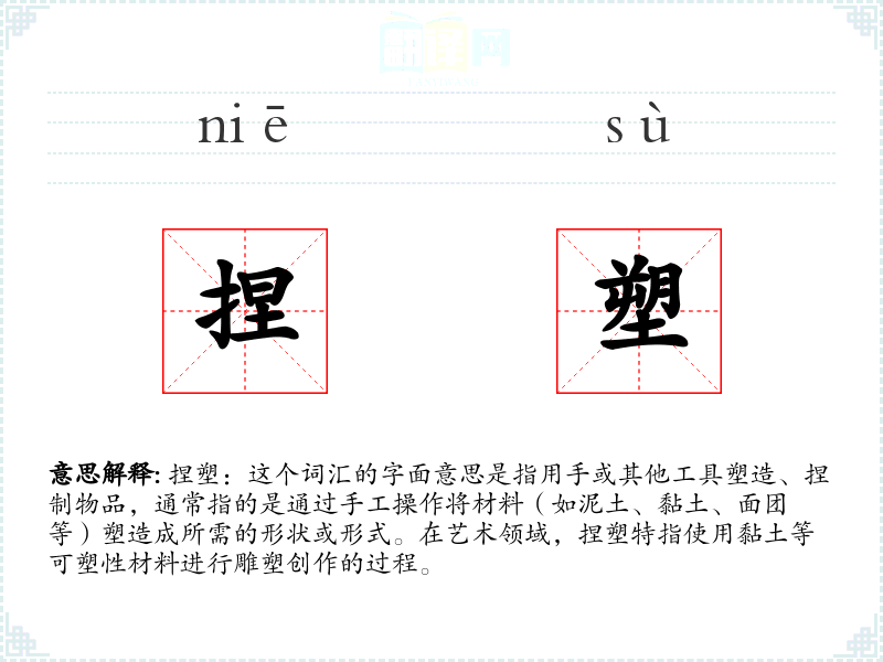 捏塑:这个词汇的字面意思是指用手或其他工具塑造、捏制物品,通常指的是通过手工操作将材料(如泥土、黏土、面团等)塑造成所需的形状或形式。在艺术领域,捏塑特指使用黏土等可塑性材料进行雕塑创作的过程。