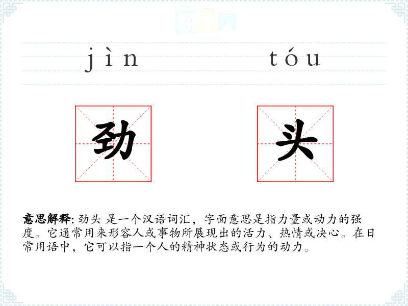 劲头 是一个汉语词汇,字面意思是指力量或动力的强度。它通常用来形容人或事物所展现出的活力、热情或决心。在日常用语中,它可以指一个人的精神状态或行为的动力。