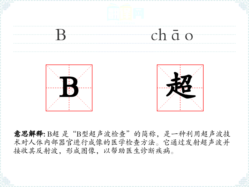 B超 是“B型超声波检查”的简称,是一种利用超声波技术对人体内部器官进行成像的医学检查方法。它通过发射超声波并接收其反射波,形成图像,以帮助医生诊断疾病。