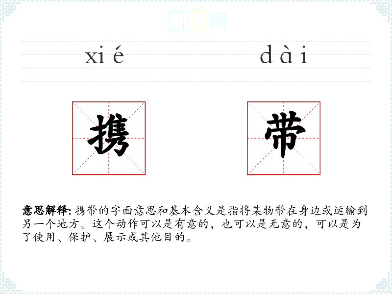 - 口语:在日常对话中,携带是一个常用词汇,如“别忘了携带你的身份证。”
