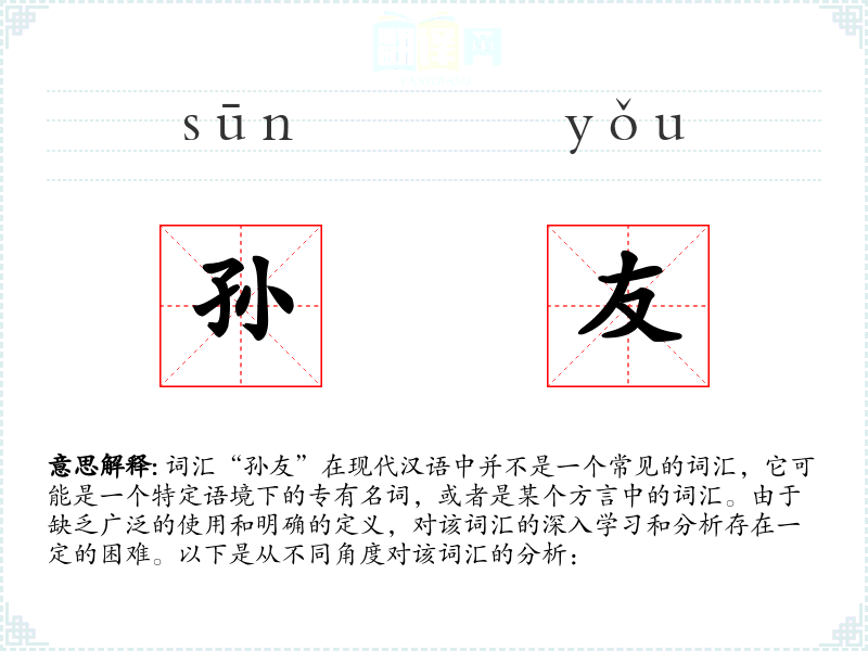 由于“孙友”不是一个标准汉语词汇,我们无法给出确切的基本定义。它可能是指“孙子辈的朋友”或“与孙子同龄的朋友”,但这仅仅是基于字面意思的猜测。