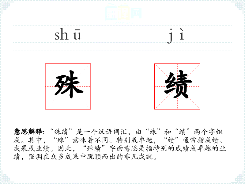 “殊绩”是一个汉语词汇,由“殊”和“绩”两个字组成。其中,“殊”意味着不同、特别或卓越,“绩”通常指成绩、成果或业绩。因此,“殊绩”字面意思是指特别的成绩或卓越的业绩,强调在众多成果中脱颖而出的非凡成就。
