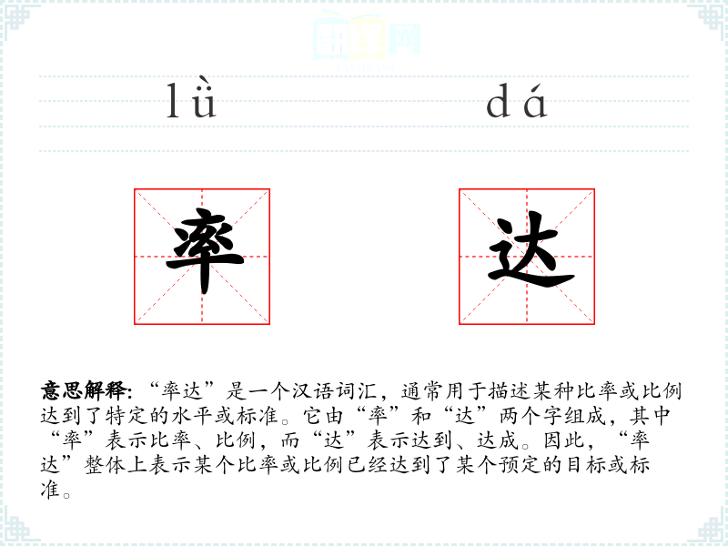 “率”字最早见于甲骨文,原意为带领、率领,后引申为比率、比例。“达”字最早见于金文,原意为到达、通达,后引申为达成、达到。两者结合形成的“率达”一词,主要用于描述比率或比例的达成情况。