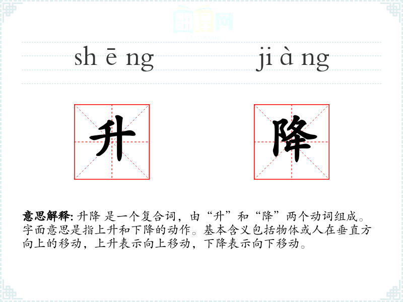 升降 是一个复合词,由“升”和“降”两个动词组成。字面意思是指上升和下降的动作。基本含义包括物体或人在垂直方向上的移动,上升表示向上移动,下降表示向下移动。