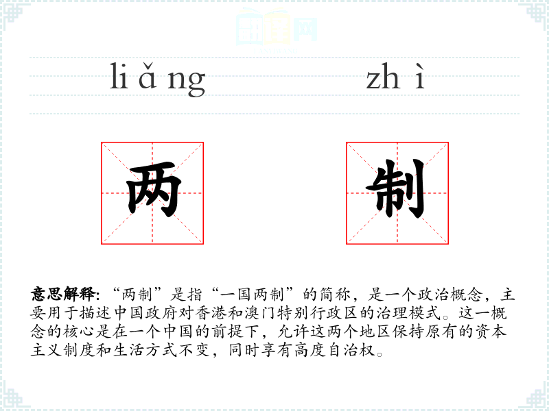 “两制”是指“一国两制”的简称,是一个政治概念,主要用于描述政府对香港和澳门特别行政区的治理模式。这一概念的核心是在一个的前提下,允许这两个地区保持原有的资本主义制度和生活方式不变,同时享有高度自治权。