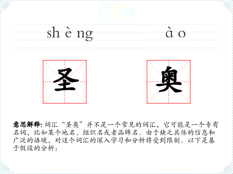 词汇“圣奥”并不是一个常见的词汇,它可能是一个专有名词,比如某个地名、组织名或者品牌名。由于缺乏具体的信息和广泛的语境,对这个词汇的深入学*和分析将受到限制。以下是基于假设的分析:
